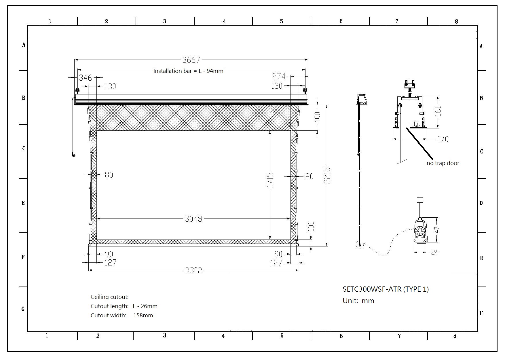 Sapphire Akustik-Leinwand mit Deckenbefestigung, gewebt, 16:9-Format, Sichtfeld ca. 3010 mm x 1693 mm, Gehäuseabmessungen (ohne Sicke): L 3641 mm x H 161 mm x T 170 mm