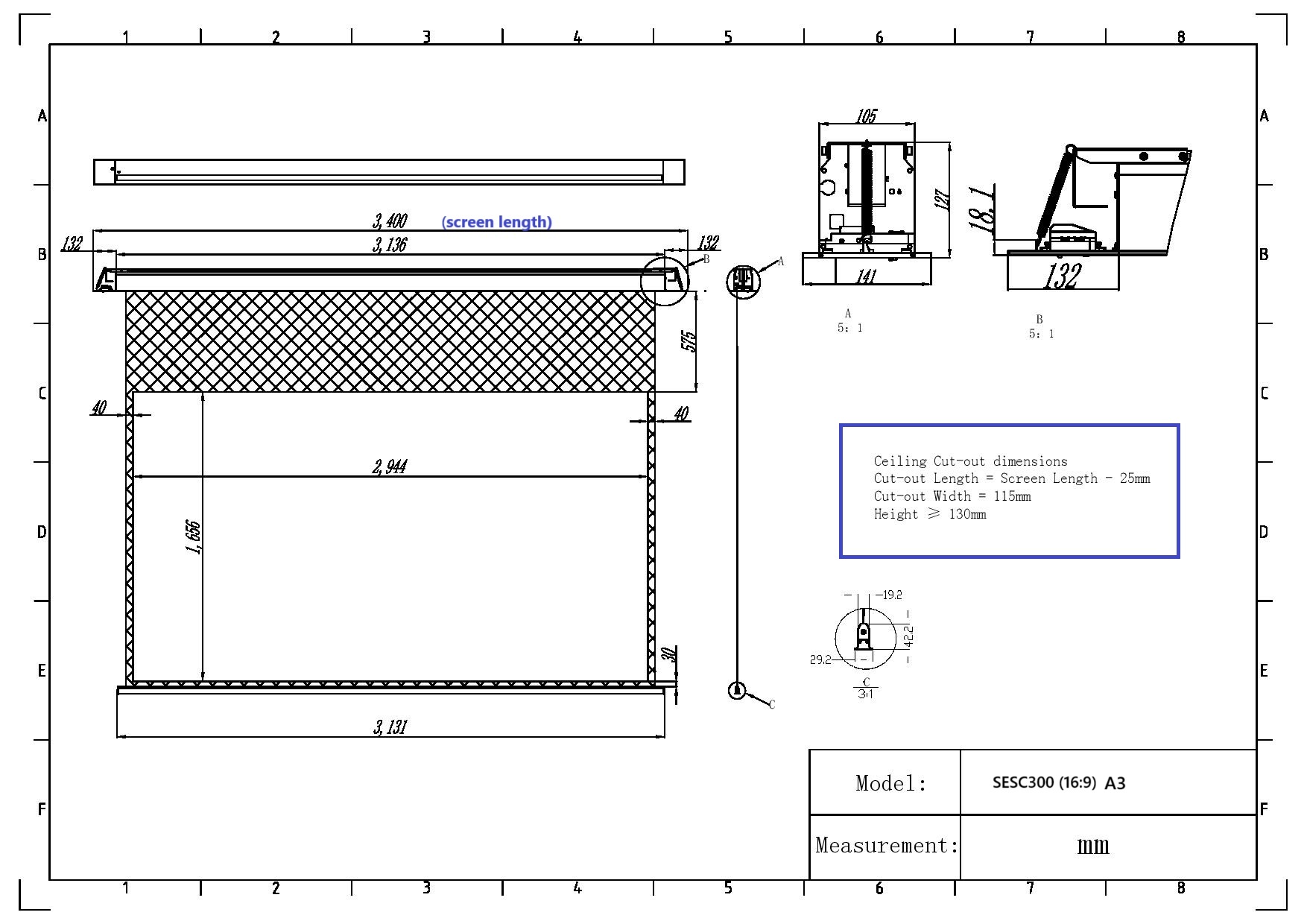 Sapphire Dedicated Electric Recessed Screen 16:9 ratio Viewing Area 2944mm x 1656mm Approx Case Dimensions Not Including Surround L 3136 x H 127 x D 141mm