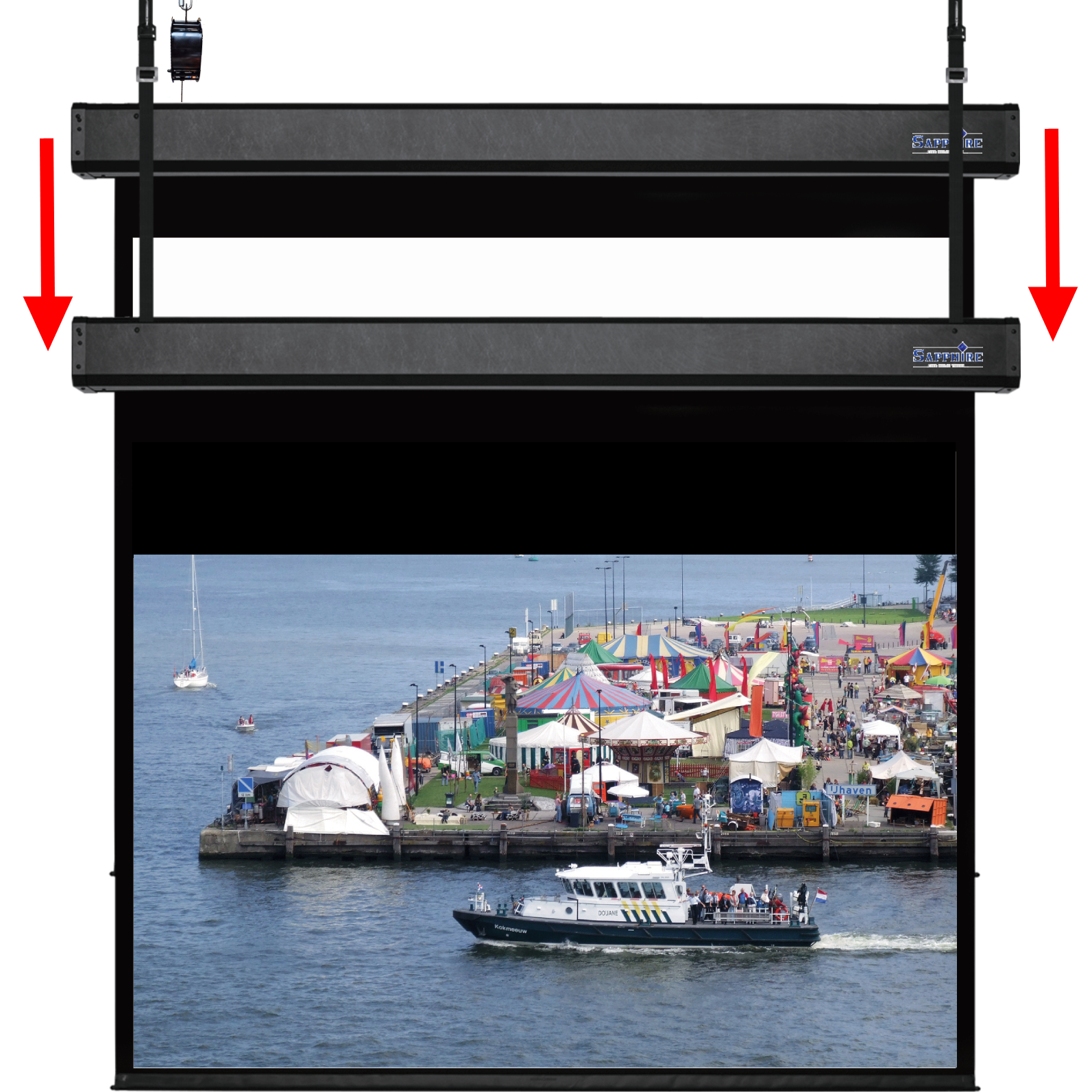 THIS SCREEN HAS AN INBUILT DUAL MOTOR THAT OPERATES THE CASE AND HOIST SEPARATELY WITH USING ONLY ONE REMOTE CONTROL, MAKING THIS THE PERFECT SOLUTION FOR HIGH CEILING APPLICATIONS SUCH AS CHURCHES, SCHOOL HALLS, AUDITORIUMS AND THEATRES.>