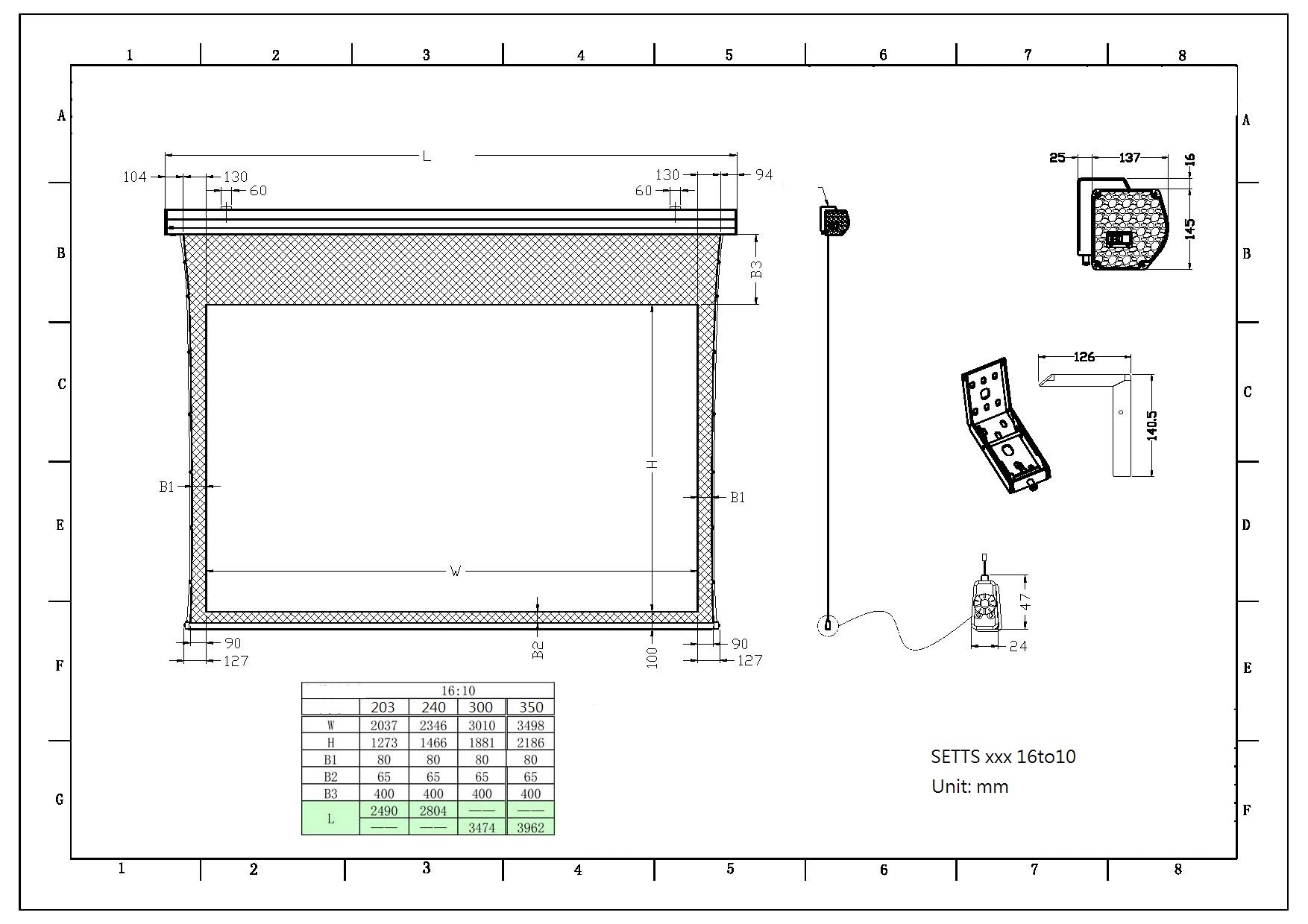 Sapphire 139" Tab Tension Electric Infra Red Screen 16:10 Format Viewing Area 3010mm x 1881mm Approx Case Dimensions L 3538mm x H 143mm x D 135mm