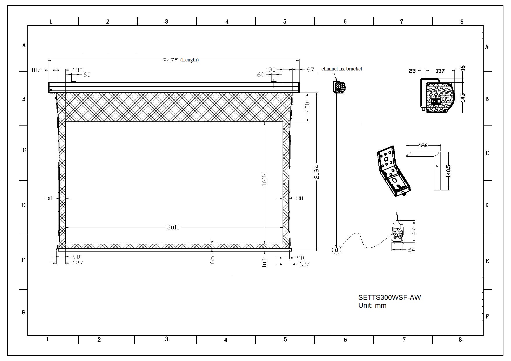 - Channel fix brackets allow the Screen to be wall or ceiling mounted at any position along the casing.
